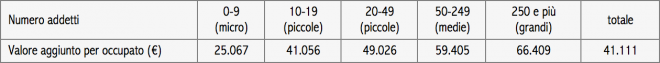 La tabella 1 mostra che la produttività del cosiddetto business sector – il totale economia meno il settore pubblico, le utility e il settore immobiliare – cresce al crescere della dimensione di impresa. Una micro impresa ha un valore aggiunto per occupato di poco superiore a 25mila euro. Pari al 61 per cento della produttività di un’azienda media e pari al 38 per cento della produttività media di una grande impresa. C’è poco da dire: le micro imprese sono poco produttive. E ciò vale anche per le piccole.