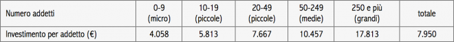 Una delle ragioni per cui le micro imprese sono poco produttive è perché investono di meno. Le micro spendono in beni materiali, macchinari e attrezzature circa 4mila euro per occupato, la metà di quanto investe un’impresa media e meno di un quarto di una grande azienda. Un’impresa che investe meno, accumula meno capitale e avrà una minor produttività del lavoro.