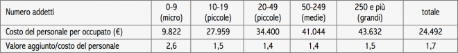 A determinare la competitività e la crescita aziendale non è però la produttività, quanto il confronto tra produttività e costi, prima di tutto quelli del personale (salari più oneri sociali). E dal confronto di produttività e costi (e dei margini di profittabilità impliciti) si capisce meglio come fa a sopravvivere il piccolo. Le micro imprese hanno un costo del personale inferiore a 10mila euro per occupato, molto più basso di quello delle imprese nelle altre classi dimensionali. Forse impiegano persone in nero; di sicuro pagano salari più bassi e non sono soggette agli stessi oneri sociali delle imprese più grandi. Fatto sta che il rapporto tra valore aggiunto e costo del personale è nettamente più alto per le micro (2,6) che per le altre imprese (tra 1,4 e 1,5).