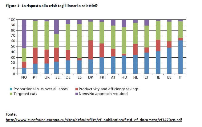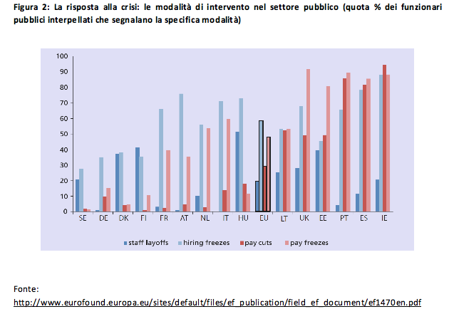 Tuttavia, come viene messo in evidenza dal recente rapporto EuroFound 2014 (Figura 1), la scelta di fondo è rimasta incentrata sui tagli lineari e su una attitudine largamente difensiva (blocco del turnover, blocco della contrattazione) e, come tale, inevitabilmente incapace di incidere sui processi produttivi del comparto del pubblico impiego e sui suoi livelli di efficienza. La comparazione con i comportamenti prevalenti in altre grandi economie europee non merita commenti e la dice lunga sulla attitudine dei nostri ministri della Funzione pubblica a sentirsi rappresentanti del pubblico impiego piuttosto che del cittadino. Se da un lato, quindi, non è mancata la consapevolezza della serietà del problema, dall’altro, sembrano invece essere state assenti non solo la forza e la volontà politica ma soprattutto le strategie e le competenze necessarie per attuare serie riforme strutturali ed organizzative della pubblica amministrazione capaci di incidere sul modo stesso di essere della pubblica amministrazione e sul suo rapporto con i cittadini. In questo senso, le sentenze più o meno recenti della Corte costituzionale potranno piacere o non piacere ma non hanno fatto altro che sottolineare la debolezza strategica e la scarsa determinazione dei governi dell’ultimo decennio.