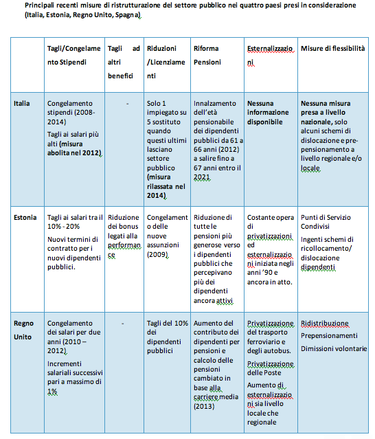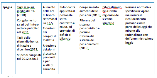 Infine, la terza considerazione prende come esempio la Spagna, nazione spesso accostata all’Italia durante il periodo più acuto della crisi. Anche in questo caso si può osservare come, soprattutto a partire dal 2010, il processo riformatore nel settore pubblico sia stato molto intenso e come, rispetto al nostro paese, l’esecutivo spagnolo sia intervenuto in materia di “consolidamento fiscale” in maniera molto più netta e con obiettivi ben precisi e molto ambiziosi. Oltre all’innalzamento dell’orario di lavoro (portato a 37,5 ore settimanali) e all’eliminazione di molti bonus legati alla performance, il governo Zapatero e poi quello Rajoy hanno ridotto coraggiosamente i giorni di malattia, alcuni diritti di anzianità e i periodi di ferie, hanno tagliato (del 5 per cento in media) i salari e congelato le retribuzioni per il periodo 2012-2013, sono intervenuti sulle pensioni bloccando gli aumenti di tutte le pensioni pubbliche ed innalzando lo scatto della pensione dai 64-65 anni ai 67, e hanno incominciato un’importante progetto di esternalizzazione (a livello regionale) del settore sanitario.