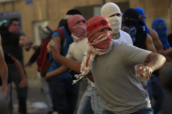 Dimostranti palestinesi lanciano pietre contro la polizia israeliana a Gerusalemme est (foto LaPresse)