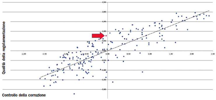 La corrispondenza di due indicatori, relativi uno alla corruzione e l’altro alla qualità della regolazione, intrinsecamente connessa anche alla quantità, parla da sola: più l’ambiente normativo è incerto, farraginoso, stratificato, oscuro, più si annida il malaffare e l’opacità dei comportamenti (vedi il grafico qui accanto, un’elaborazione dell’Istituto Bruno Leoni su dati della Banca mondiale, in rosso l’Italia).