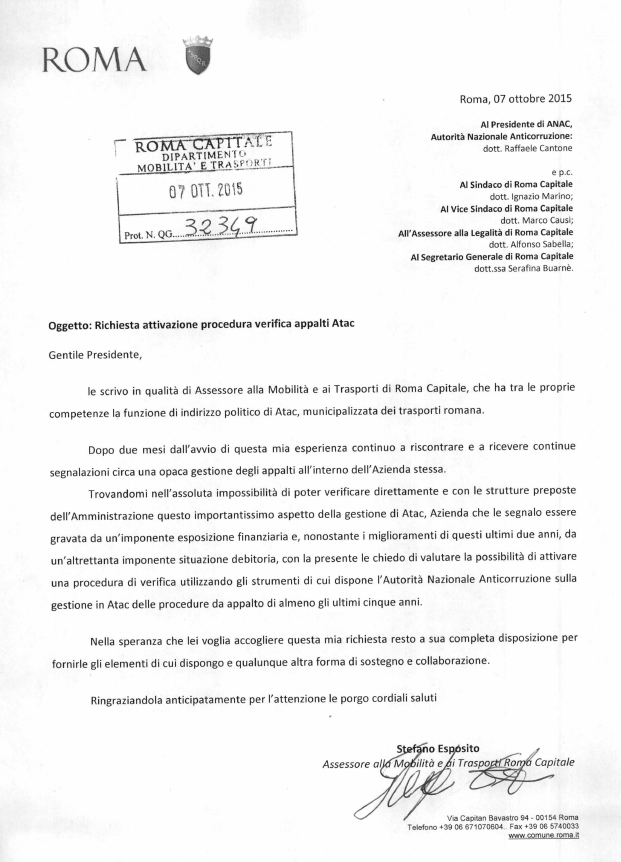 Romanzo, climax e dimissioni in un marasma capitale Il caso più significativo per capire il modo maldestro con cui Marino ha provato a combattere l’illegalità con il moralismo piuttosto che con l’efficienza è legato alla storia della più importante azienda di trasporto pubblico italiana, l’Atac, cuore pulsante dell’universo della Vacca romana, come raccontato qualche giorno fa dal Foglio. La notizia che il Foglio ha appreso oggi è che il giorno prima di dimettersi da assessore ai trasporti, il senatore del Pd Stefano Esposito – che ha provato a studiare le ragioni del buco da 550 milioni di euro dell’azienda del trasporto pubblico romana – ha inviato all’autorità anti corruzione guidata da Raffaele Cantone una lettera in cui chiede all’Anac di approfondire il dossier dell’Atac. Il Foglio pubblica in anteprima il contenuto del documento.