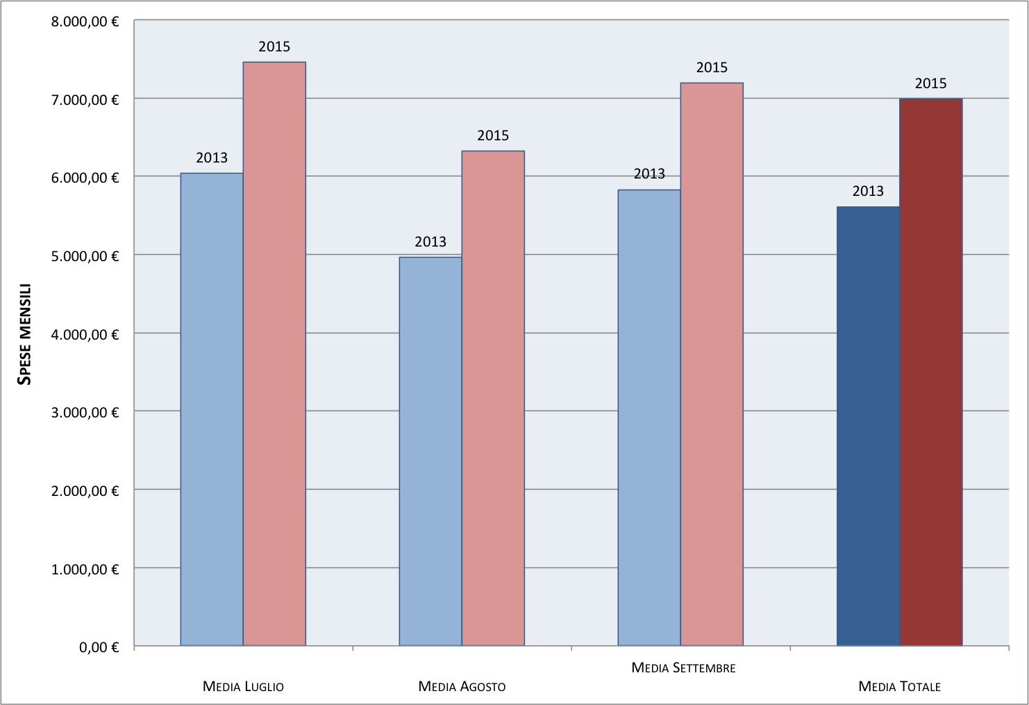 Per fare un confronto sull’evoluzione delle spese a cinque stelle abbiamo selezionato casualmente 30 deputati, un terzo dell’attuale gruppo alla Camera (ma a una prima occhiata i dati al Senato non sembrano essere dissimili), e confrontato le dichiarazioni di spesa sui rimborsi nel trimestre luglio-agosto-settembre 2013 con lo stesso periodo del 2015. Per ogni mese abbiamo preso la spesa totale, composta dalle macrocategorie della diaria e della spesa per mandato, e ne abbiamo calcolato la media, per confrontarla con la stessa a distanza di due anni.