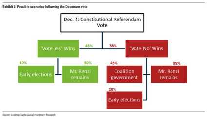 Chi ha vinto? Goldman Sachs. La banca d’investimento americana aveva preso molto bene le misure del futuro di Renzi. Il soggetto era stato impacchettato così in questo grafico che avevamo pubblicato nel numero del 3 dicembre: