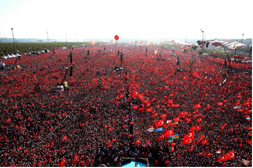 Bandiere turche sventolate in piazza a Istanbul durante un comizio di Erdogan (foto LaPresse)